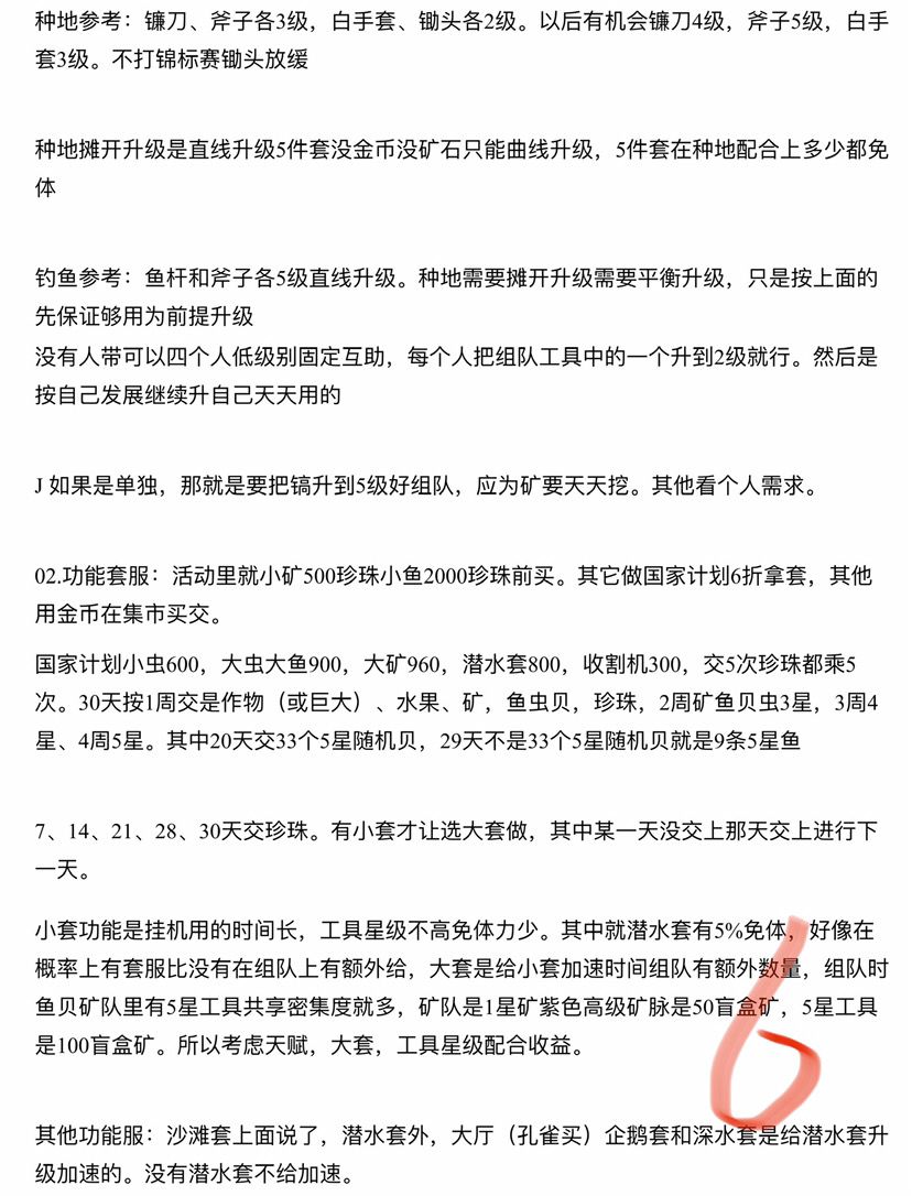 种地参考:镰刀、斧子各3级,白手套、锄头各2级。以后有机会镰刀4级,斧子5级,白手套3级。不打锦标赛锄头放缓,
