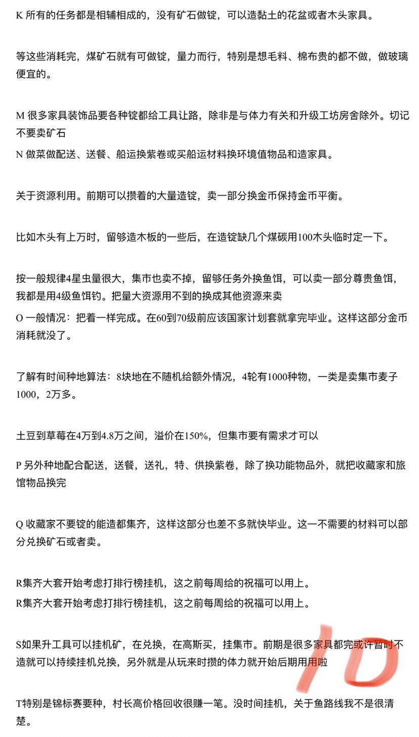 日常要10个矿石就给矿砂。后期改交云母、石墨、磁石等,交50作物给草,种草免体力有上限每天,得毛毛虫换初级鱼饵。交鱼给1星鱼