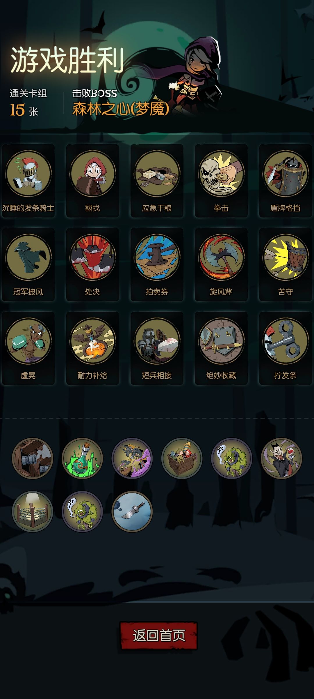 最主要的牌还是那几张就是旋风斧、拳击、盾牌格挡、应急干粮再加上一张翻找,其他的牌主要是为了过怪。