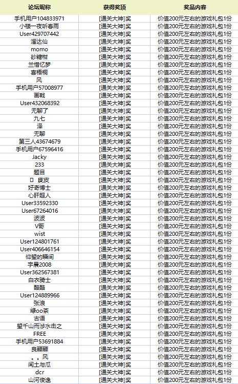 感谢大家参与本次活动,今日公布以下玩家获得本次活动的奖品!