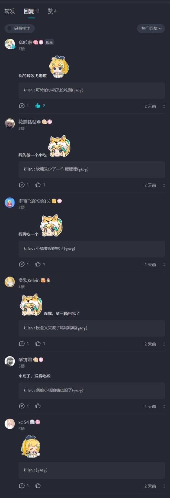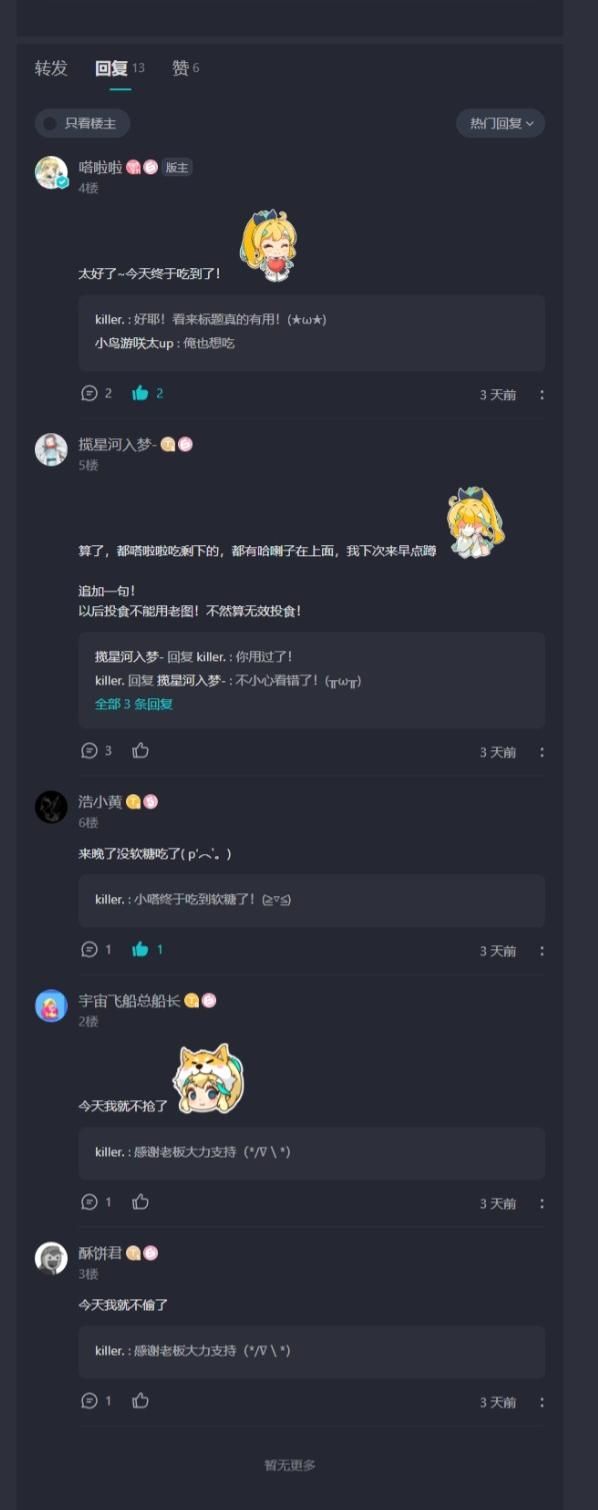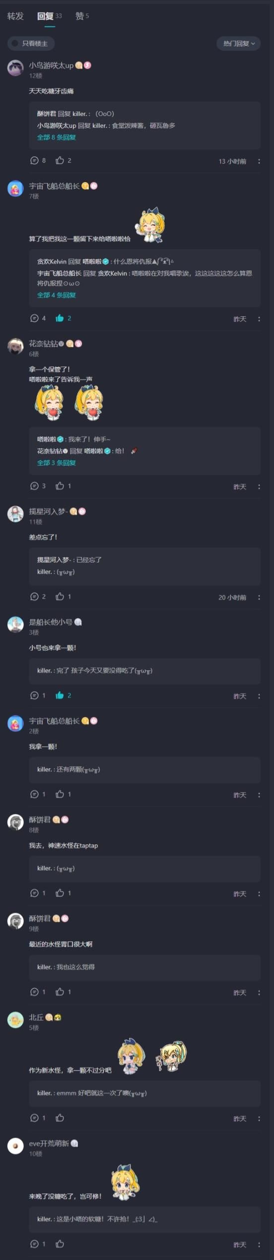 水怪 宇宙飞船总船长 在此呼吁各位水怪在发现投食帖时遵守“一人一糖”的原则,保障更多水怪和嗒啦啦能够吃到软糖,也希望水怪可以在嗒啦啦营业之前帮助嗒啦啦保管软糖,传承美好品德![[嗒啦啦2_DOGE]](https://img.tapimg.com/market/images/511fd03a9588081e92eb7cd01b126b90.png)