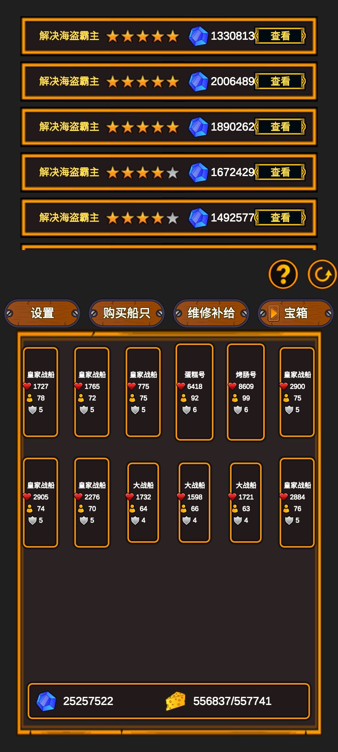 看广告不断刷新高船只,看到点【大战船】【皇家战船】还有【烤肠号】,就直接买下来。那个烤肠号简直无敌,但是价钱也很贵要1800万蓝色石头。【蛋糕号】1400万蓝色石头。
