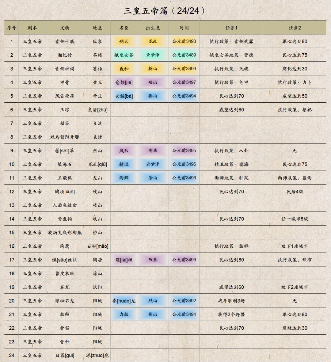 3.来自@至道得一的建议,已在图片中加入了文物相关名臣的同剧本出生点及时间(因此贴主题为文物获取,为了便于阅读,除名臣出现剧本与相关文物不属于同一剧本的特殊情况外,在多个剧本皆出现过的名臣并未进行额外标注)。