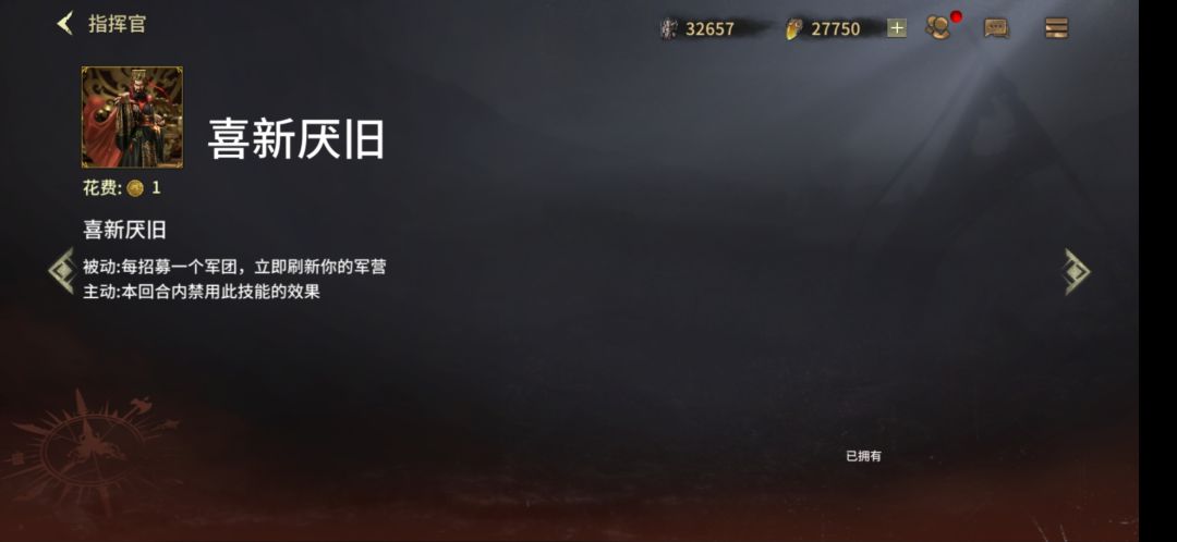 1.喜新厌旧:这当属渣男技能了,别看这个词很渣,但是每买一次军团,就会自动给你刷新。如果军营有几个你想买的军团,你就要点技能锁定,就可以买完这一个版面你需要的卡牌。这个指挥官在征战竞技都可用,同时也适用各个阵营。渣男真是无所不能,才有渣的资本,是不是超级完美呢?