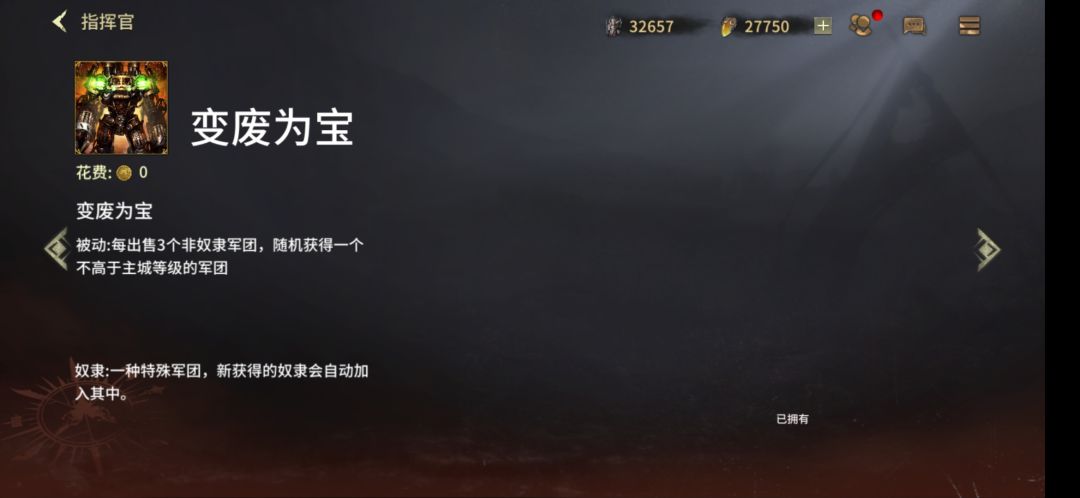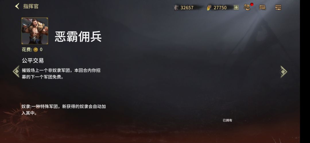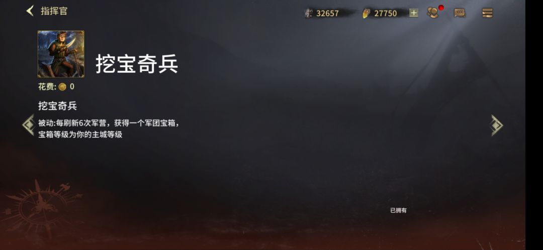 这个指挥官,像我这种喜欢赌本的玩家(直升四本)特别喜欢了。前期可买流寇力士,技能以后就有两次刷新,在升本后,还可以买一个高本的军团,战力差距就不会拉很大,可以放心的升本。而且一换一,不论前期后期都是特别划算的。