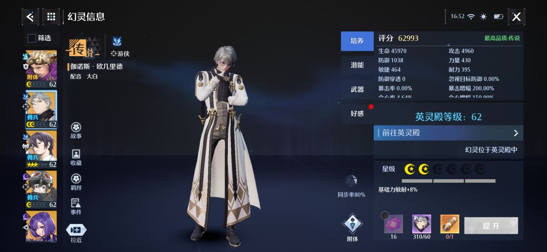 幻灵特训里可以利用伽诺斯吸引仇恨躲避伤害。提高其他幻灵输出空间和伤害 培养指南 伽诺斯可以两种培养指南,第一种就是和我一样,仅过度使用,传说幻灵强度上来了就当佣兵用,第二种可以主升,也有很多人选择主升,主升伽诺斯的好处在于伽诺斯能很快升满,并且耗费材料少,如果出新的强度很高的传说幻灵转行比其他玩家优势更大。二者各有强势处,还需各位慎重选择