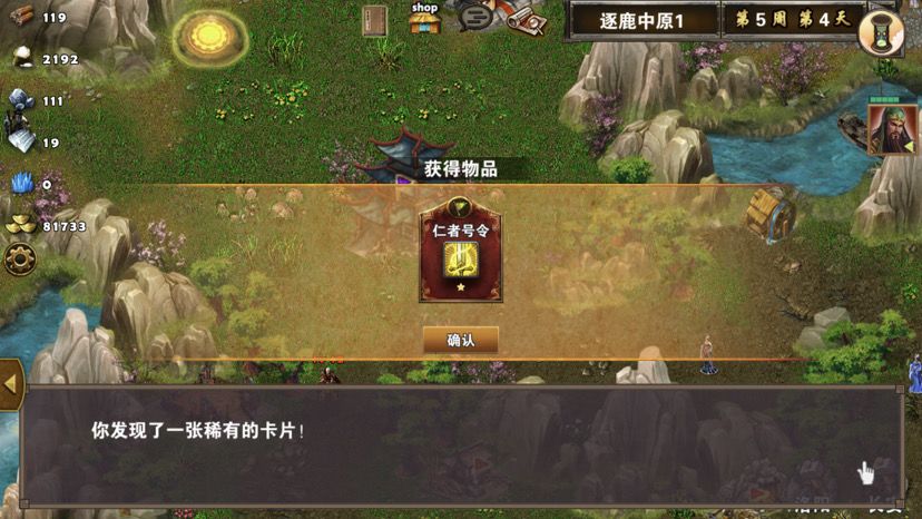 仁者号令只能做辅佐战术卡,用的地方不多,可在娱乐图逐鹿中原1获得。此图难度一般,开局可在两个阵营中选择一个英雄出战,建议使用贾诩或者太史慈比较好打,我没有买英雄只有几个免费英雄,所以就用关羽,装备一般,兵种选择根据自己喜好,战术卡上对应兵种的即可,胜利条件是击败袁绍。袁绍在左上方营寨固守,开局把家门口资源和属性都拿了,然后把堵路小怪打掉过桥会遇到敌方boss,都不是很强,随便打掉,右方有座城池可以占领,城里可以招青龙,很强力,如果有青龙卡建议带上。3周后袁绍会派出大将张合、颜良出战,两个菜鸟随便打掉,过几天他们还会出来,不过没有兵随便打。这个时候可以攻城打袁绍了,袁绍兵有远程鹰卫和十多个朱雀还有虎豹骑,而且袁绍还会眩晕攻击,所以优先打死袁绍再打兵。如果觉得自己实力不足以攻城打赢袁绍,可以等到五周,五周后袁绍会离开营寨主动出击,没有城池守护随便打他,先把袁绍一回合打死,后面的兵不足为惧,打死袁绍后过关得到战术卡仁者号令。附视频、截图