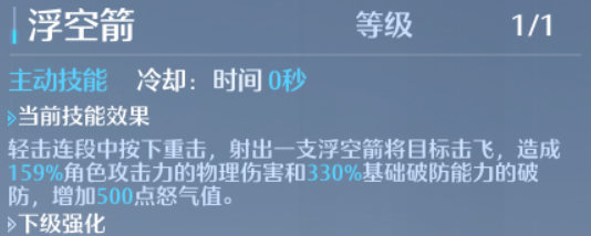 上图两个技能都是弓箭的主要输出技能,重击操作简单,只需要冒险家们无限次地按重击即可,而浮空箭相对重击而言,操作较为困难,需要在连击中按下重击,才能触发浮空箭。我推荐冒险家们在实战中多使用浮空箭,浮空箭相比于重击的优势在于:浮空箭的伤害明显高于重击且可以增加更多的怒气值。