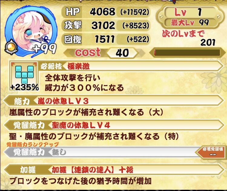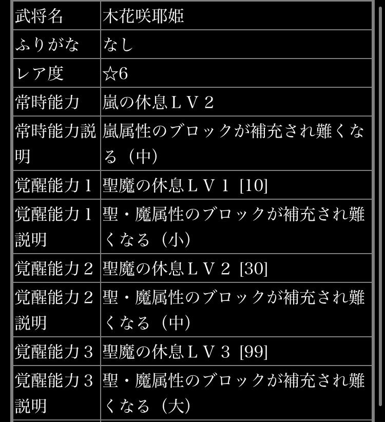 花姬 的能力,「風+圣+魔」三种属性休息,对于「火」+「水」属性的队伍,连消连击打伤害是很强力的一个辅助。前提是你要+99觉醒。
