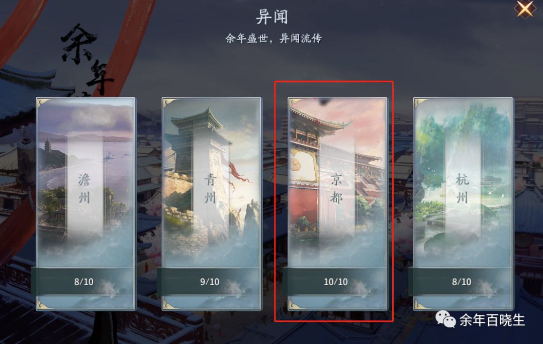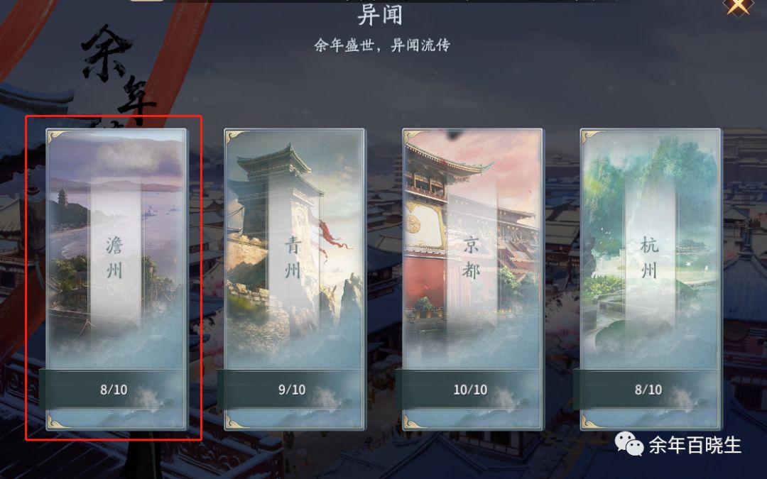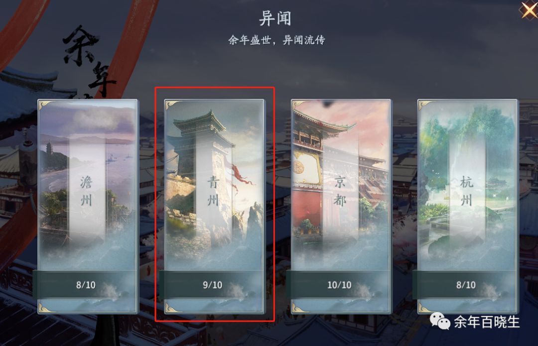 异闻一共有四个州,澹州、京都、青州、杭州。每个地图有10个异闻任务。到达相应的州后,打开当前地图,左下角有个放大镜图标,点击放大镜输入坐标就能前往。以下详细列举开启异闻的坐标。
