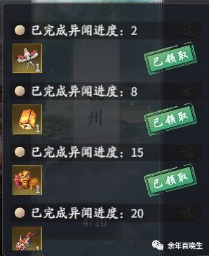 奖励:经验+绑定元宝+残卷+内功心得+铜钱+见识,具体奖励看余年志→异闻的具体内容。