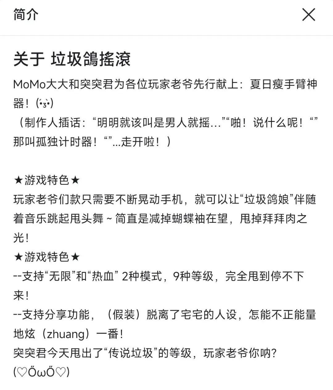 《垃圾鸽摇滚》这个游戏的玩法只有一个——拼命摇动手机,让屏幕上的计数不断增多: