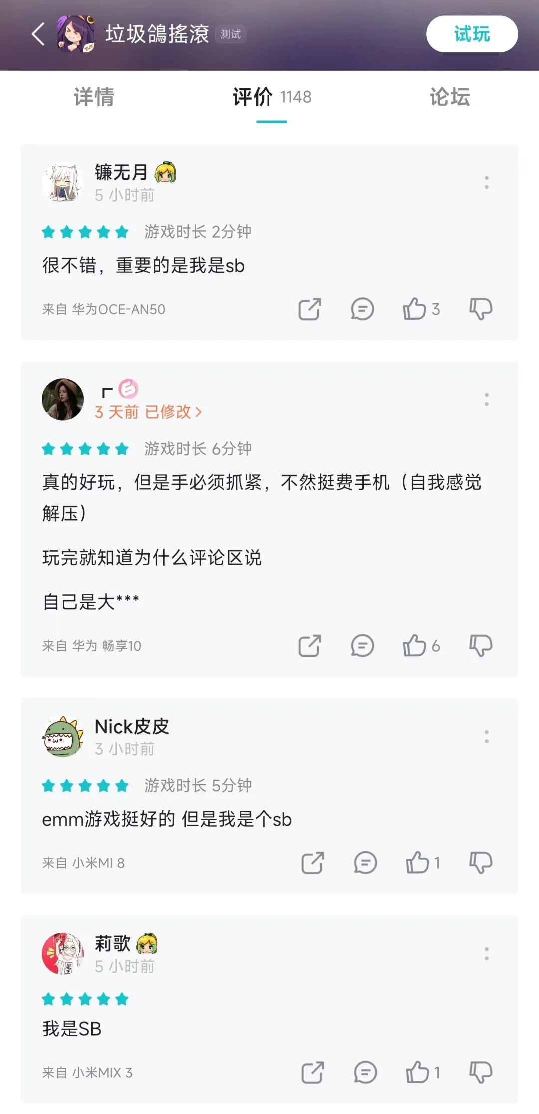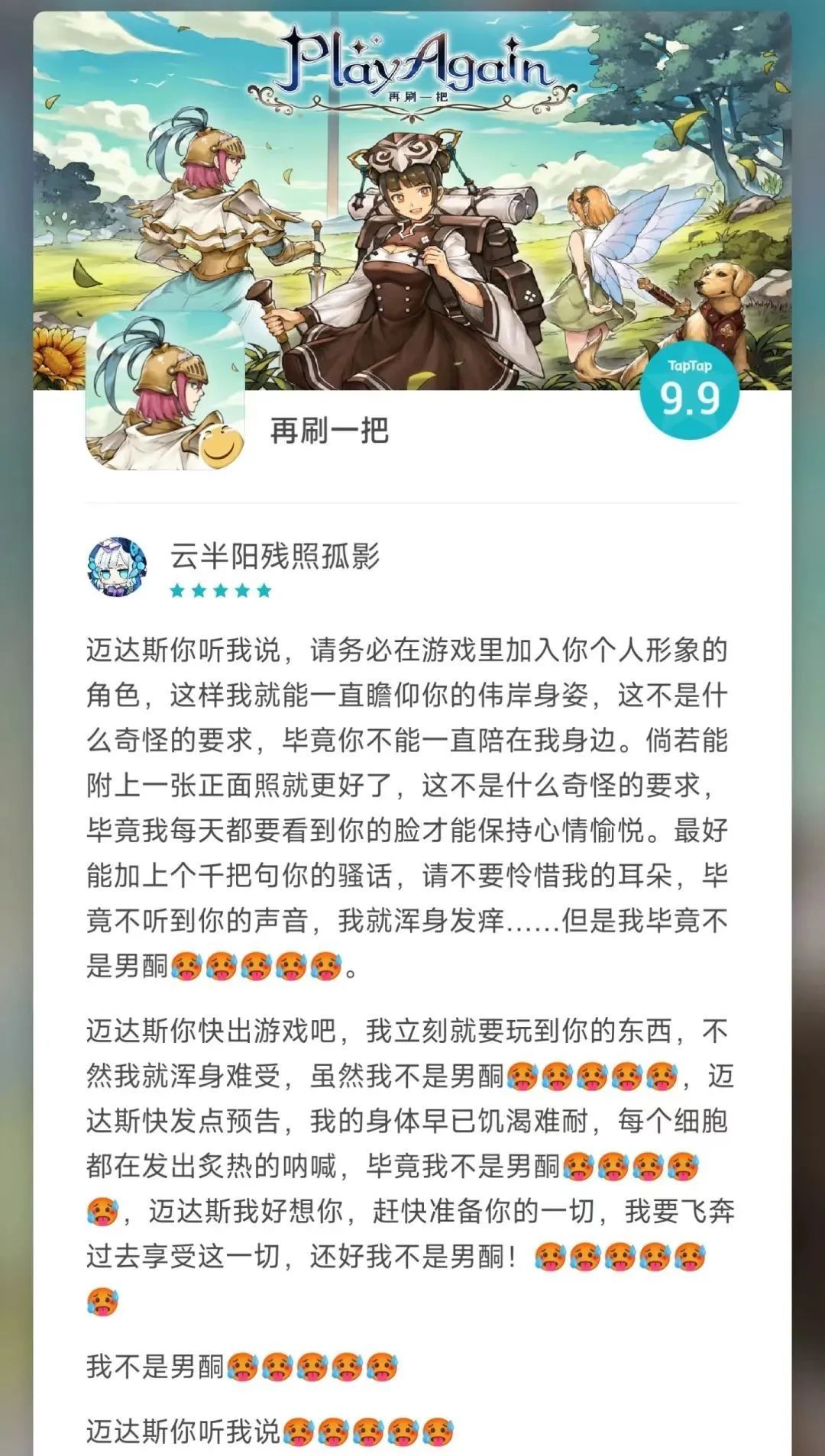 不过比起滑稽工作室《再刷一把》的评价,上面这个就有点小巫见大巫了。游戏本身是评分9.9的像素刷宝小游戏,但是评价区里玩家和开发者迈达斯的互动真是让人大开眼界,来欣赏一下三种不同画风的评价吧: