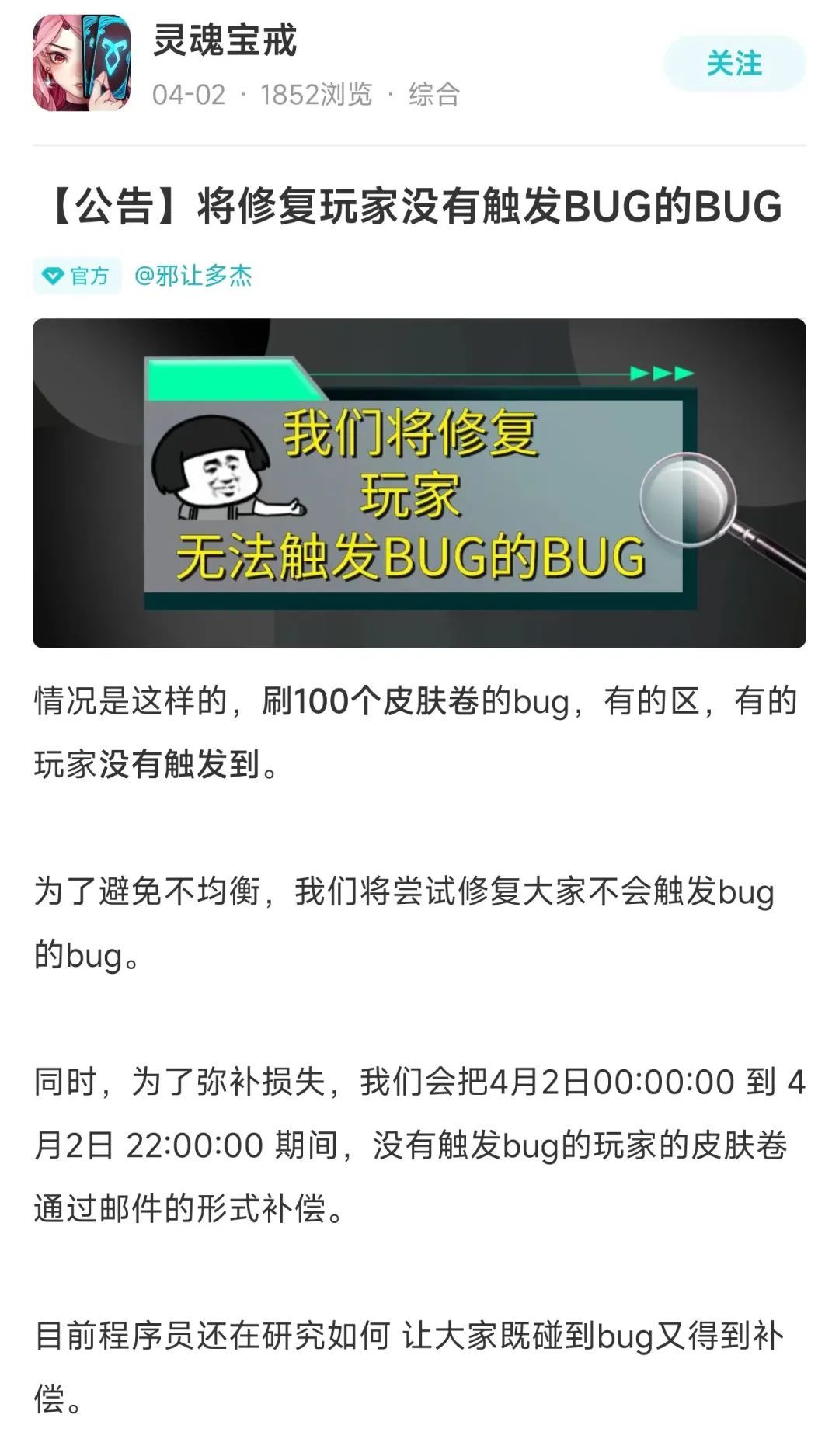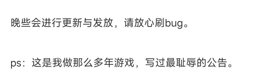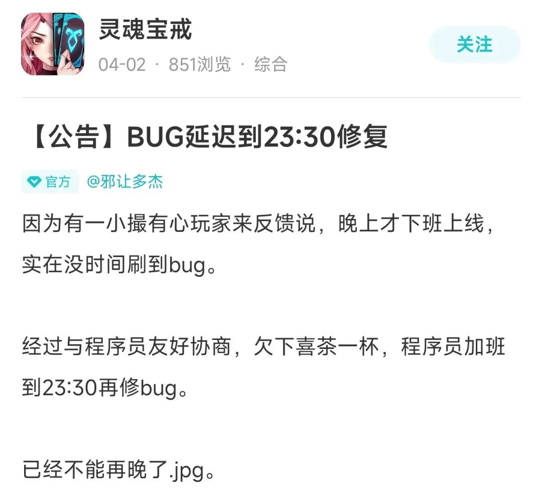 关键是这还没完,由于部分玩家表示下班比较晚,可能赶不上刷BUG,运营团队还贴心地延后了BUG修复的时间……