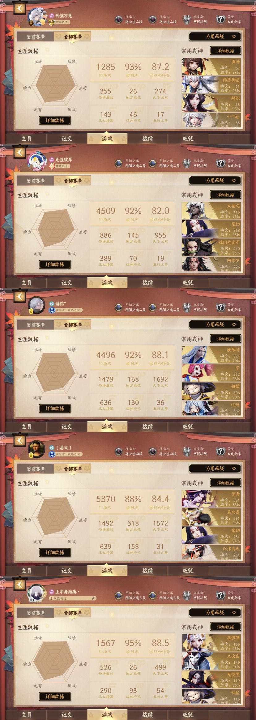 下图我们五个路人为崽而战的战绩,看看综合评分和胜率