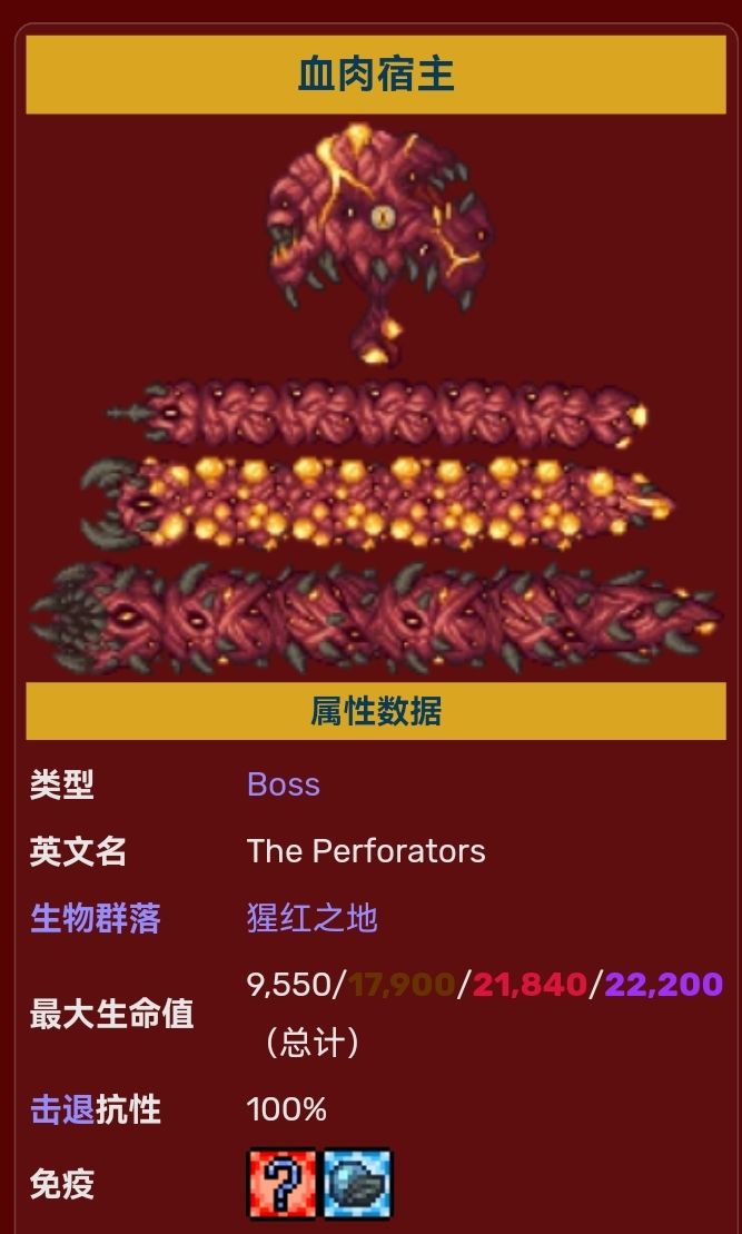 召唤:血肉宿主不会自己生成,它可以在猩红之地使用血蠕虫诱饵召唤,或是击杀血肉囊后生成。最初生成的3秒内它不会造成接触伤害。