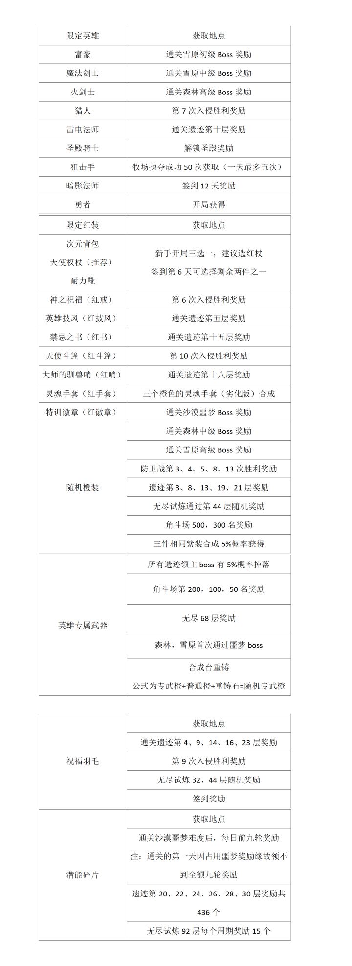 限定英雄、红装、橙装、羽毛、潜能石、专武获取方式