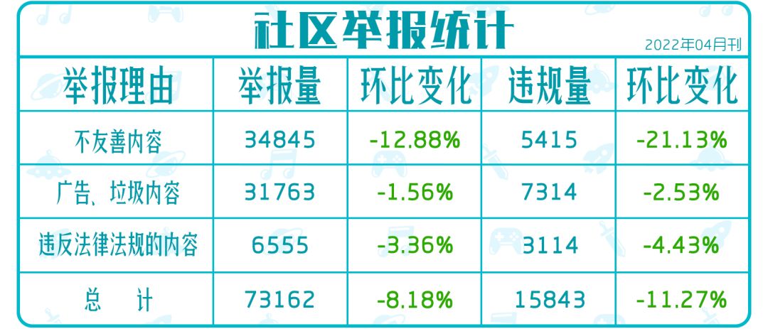 本期社区整体从举报量到违规量都有比较明显的回落。可以看出在大家的不懈努力下,整体社区的氛围积极向上,小管家给大家点个大大的“赞”!本期共收到举报73162条,核实需处理的违规内容有15843条。