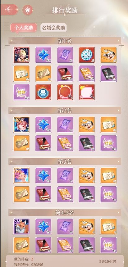 1、活动奖励分为个人榜奖励,名媛会榜奖励。
