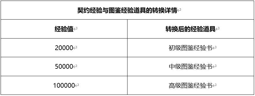 3)在旧版本中消耗的经验值将按一定比例转换为图鉴经验道具,不足一个经验道具的部分将转换为一个道具。使用图鉴道具可以升级图鉴等级(首发版本未实装)。旧版本中的契约经验与图鉴经验道具的转换详情如下所示: