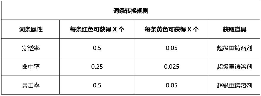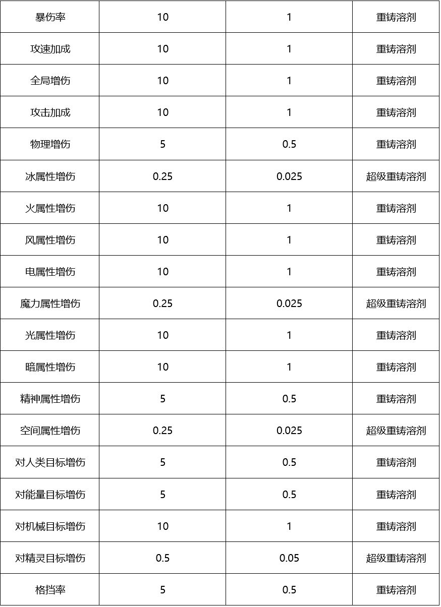 超级重铸溶剂:可以对所有等级的宝石使用,使用后可以将副词条自选为不重复的其他词条,强化的数值等比保留(例如:宝石副词条中+800独立生命值的词条转换为13%暴击率加成)。