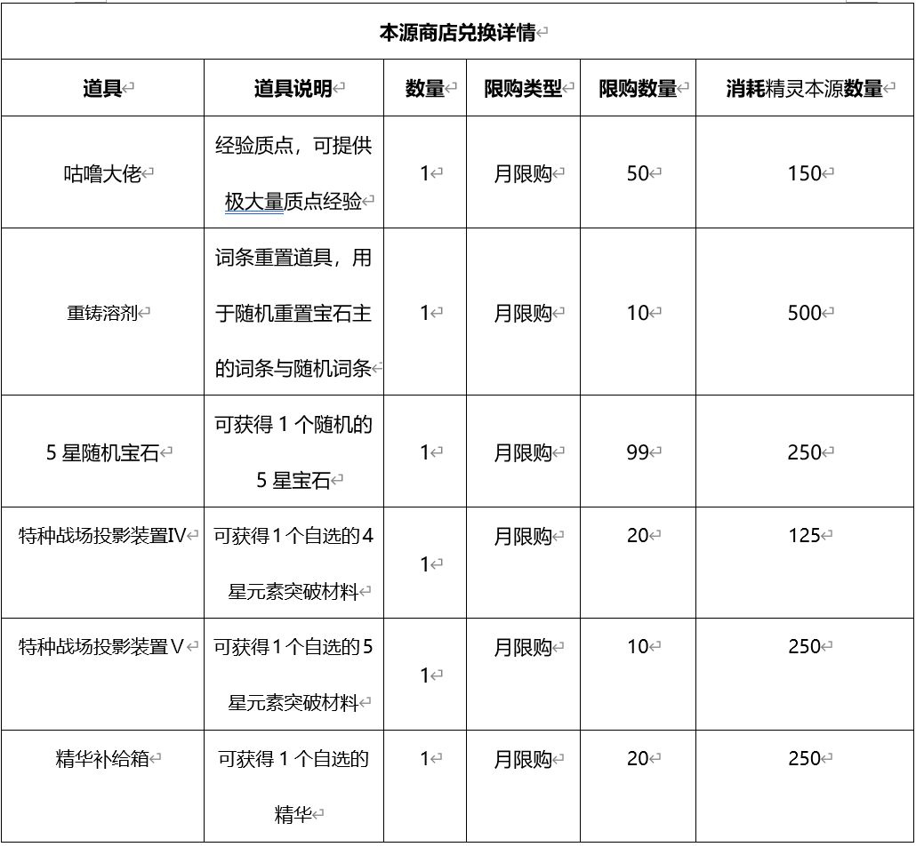 2)精灵本源可在本源商店(常驻商店)兑换新版本的养成道具。兑换详情如下所示: