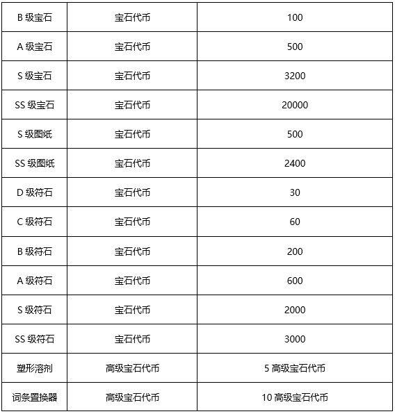 1)在新版本中,旧版本宝石及宝石系统相关的道具都会进入废弃背包,玩家手动出售后,可获得“宝石代币”。玩家可使用“宝石代币”在“宝石商店”中兑换道具。转换详情见下图: