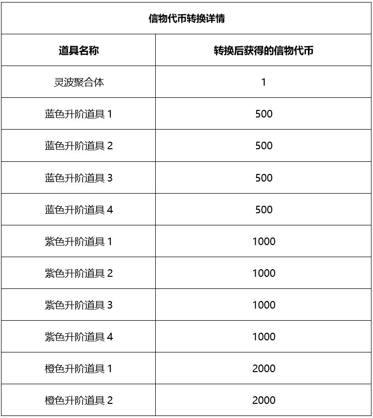 2)升阶道具与结晶类道具均转换为等价值的“信物代币”。玩家可使用“信物代币”在商店中兑换道具(首发版本未实装商店)。转换详情如下图所示: