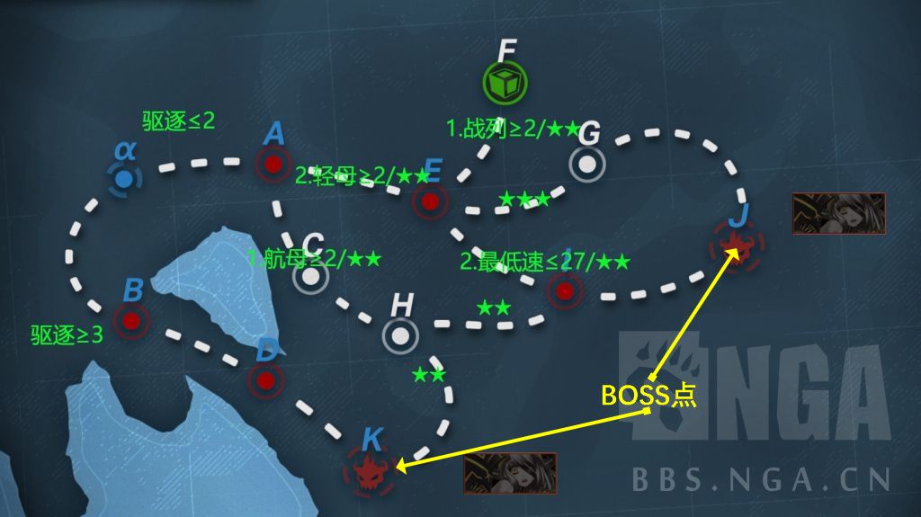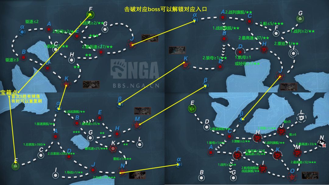 2、若为顺序式推图,则需要全部击沉后才能通过地图;若为远洋破袭,则指定boss点开启指定的地图入口(见下面的远洋破袭part)