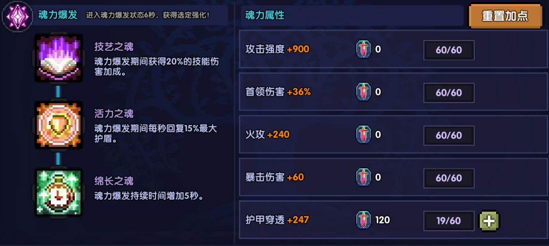 首领优先加满,穿透可以对照上面的表加点,暴击值根据自己的实际情况调整。魂力爆发选择技艺之魂和绵长之魂。不能30秒之内解决BOSS的玩家可以选择迅发之魂