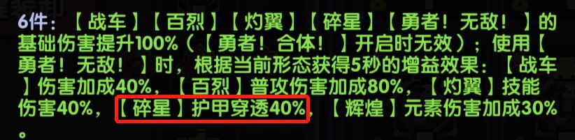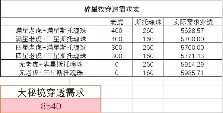 其中六件套的碎星特性要着重说明,可以额外提供你当前穿透40%的穿透,使得碎星牧的穿透要求非常非常低,具体穿透要求如下,供各位参考