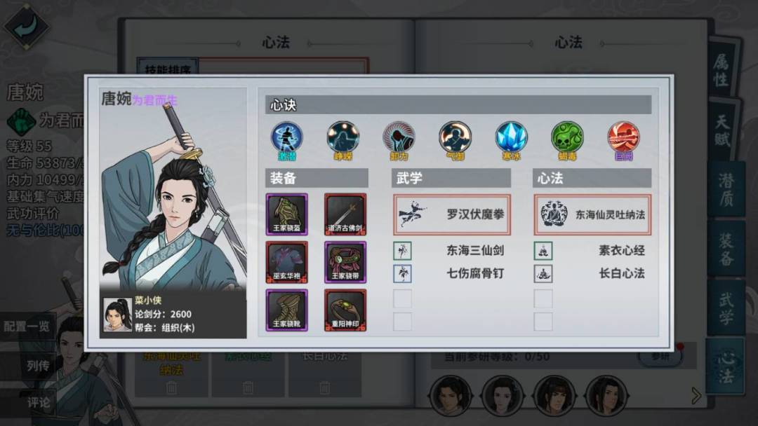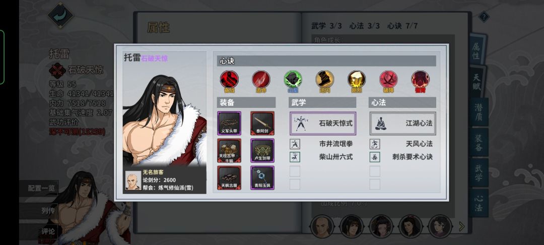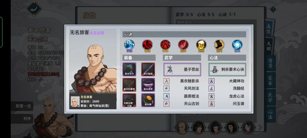 帮组织的帮友打的时候发现刺杀不带也行 主洗髓 天山古剑没参研 其他都拉满 这个BOSS墨子悲丝和太极拳比较难打 这里推荐主刀魔