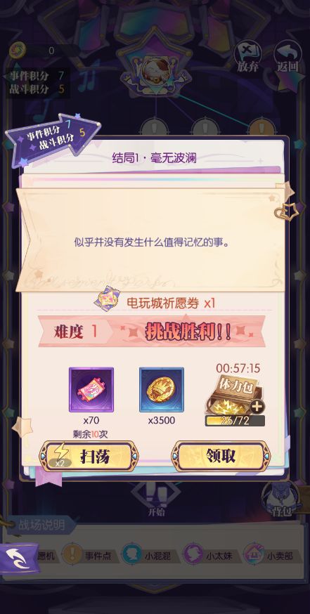 每次挑战花费2点体力,挑战完成后可花费2点体力扫荡,直接获得积分券和电玩城祈愿券。初始最多可扫荡10次;完成所有20个结局后,最多可扫荡30次。