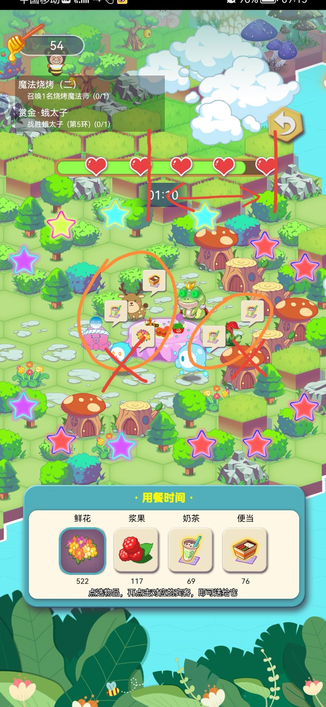 因此在达到第2颗心之前,建议喂食所有宾客,且用奏乐、烧烤和神迹,提升全体快乐值