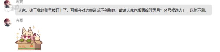 不久后,当选概率最高的仙女龙的账号被认定为违禁参赛而被取消资格,而其他几位选手的账号虽被封禁却仍能收获选票。于是乎各位吧友开始转换思路,暂且放弃民心所向的仙女龙转投第二顺位的海乃风夏,同时也有部分吧友紧握选票不放,静观事态发展。