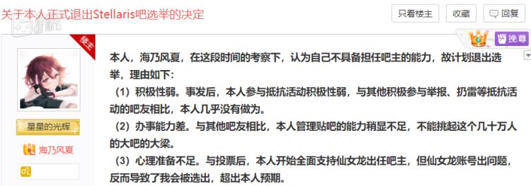 时间来到吧主选举的最后一天,4月25日,当天仙女龙的账号已然解封无望,但海乃风夏却已经恢复正常。按照此前定下的大纲,接下来的剧本应当是海乃风夏当选吧主,而荒废了半个月之久的stellaris吧也终于能在这位吧主的领导之下重振辉煌……吗?