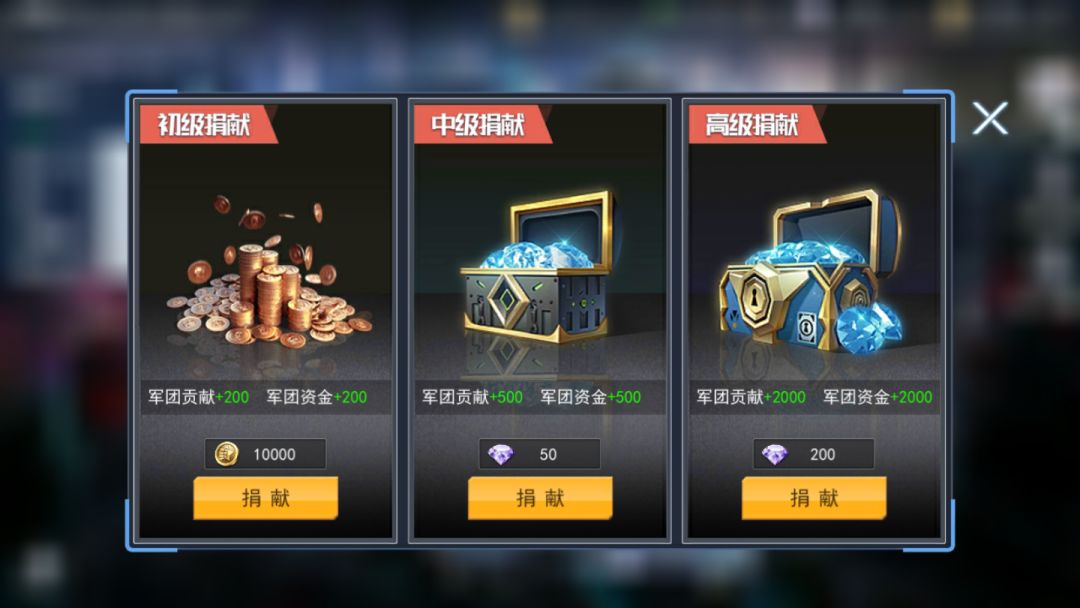 捐献就是用金币或者钻石获取军团贡献在军团商店使用的货币。