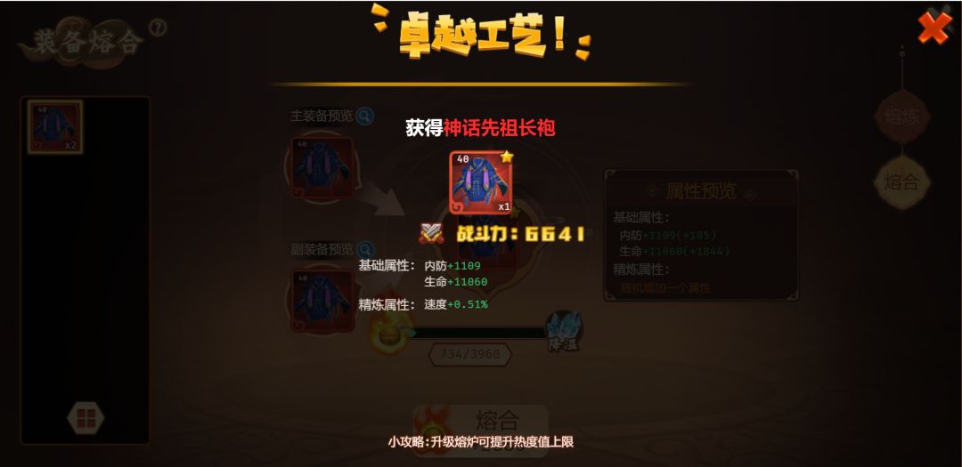 每件装备有着普通到神话的一共七个品阶,通过装备熔炼进行升阶,而随着侠客自身实力的提高,装备也需要继续成长,“熔合”功能就正好赋予了装备突破上限的可能!