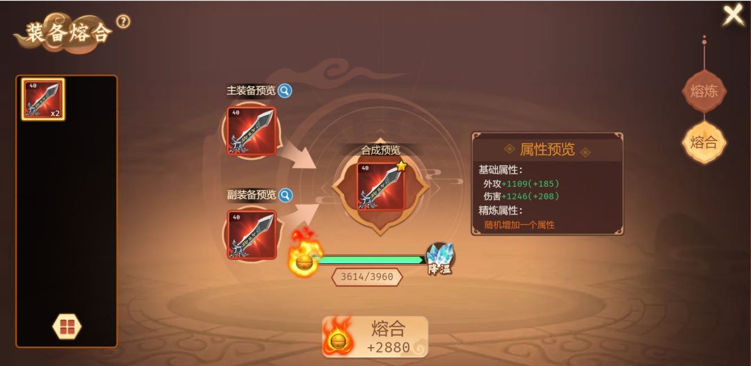 掌门使用同一品质与类型的装备进行“熔合”就能获得更高品质的装备,原始属性将会进一步提升。并且,每融合一次,都会为装备额外赋予一条“精炼属性”使其拥有更为惊艳的战斗性能!