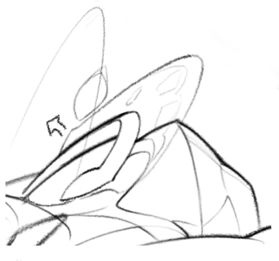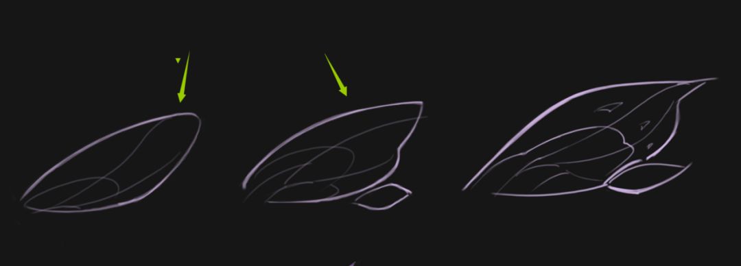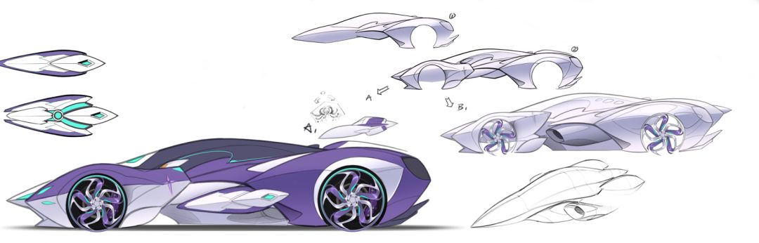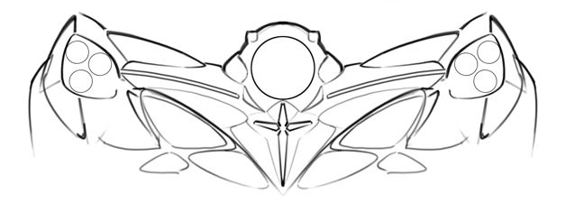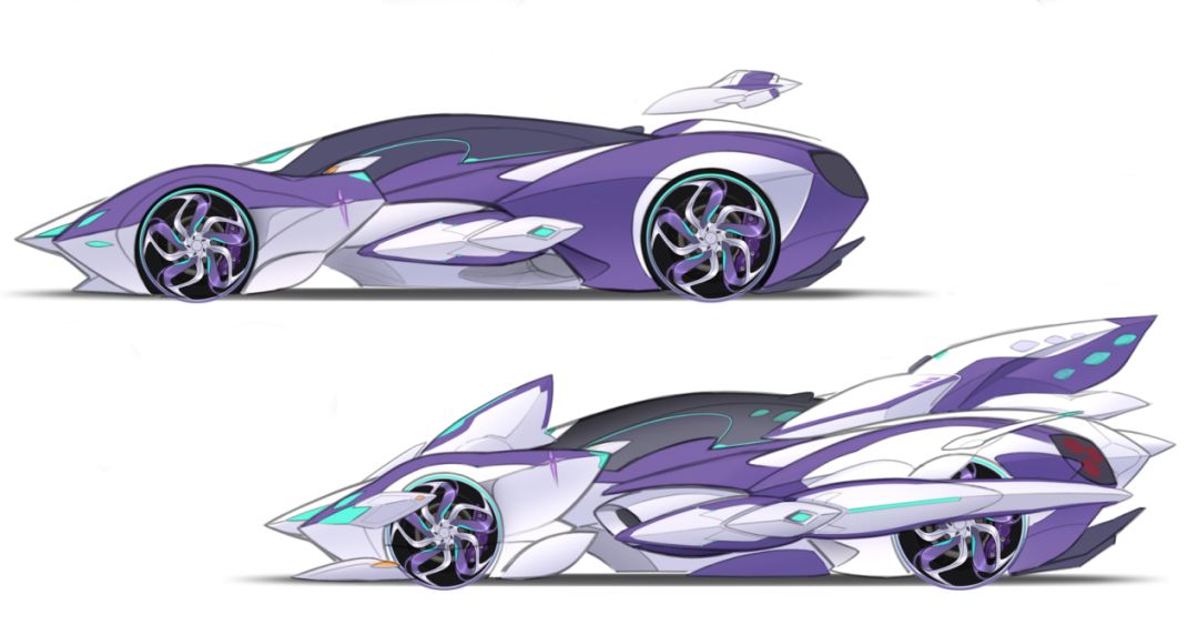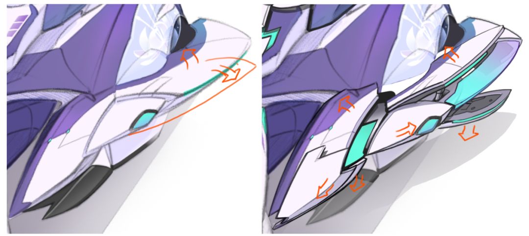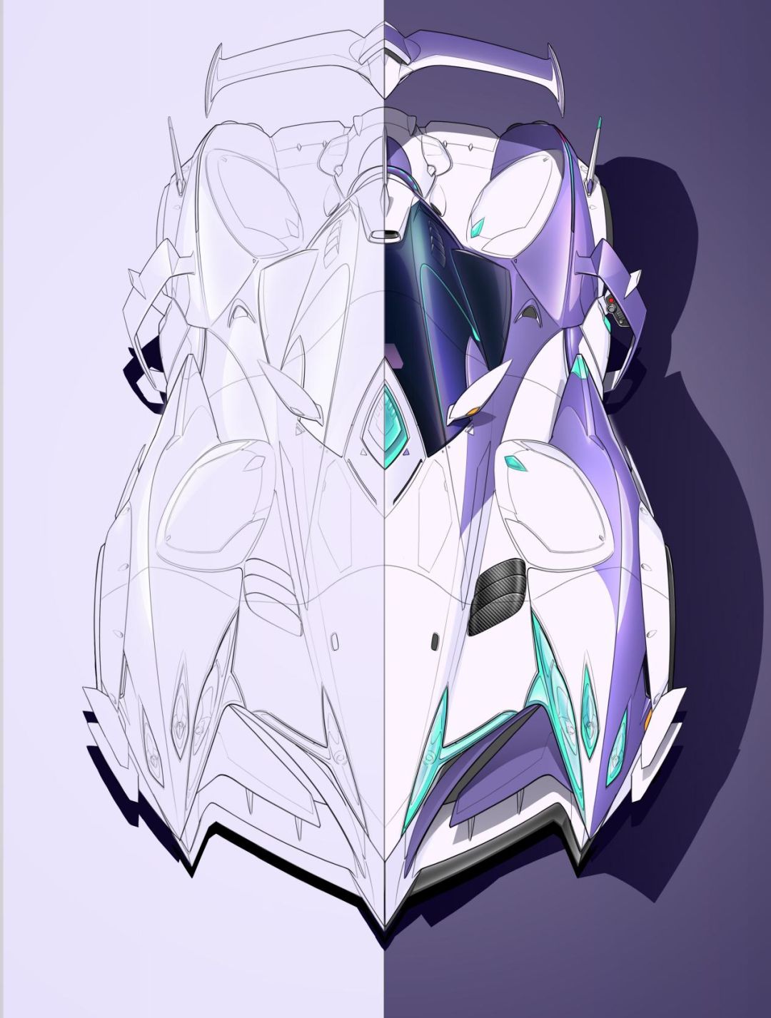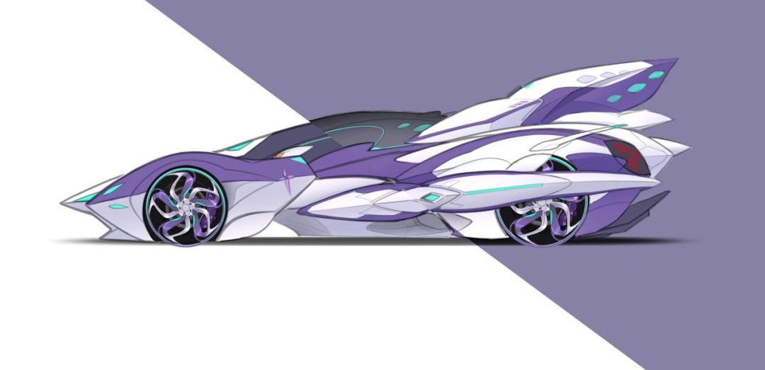美术大大以蝶翼为原型,从中提炼出了四圆角三角形布局,对线条轮廓进行设计细化,逐步融入在赛车的轮包结构中。从俯视图来看,S-星煌的轮包布局接近于蝶翼形状,这也是后期特效变形的关键部位。