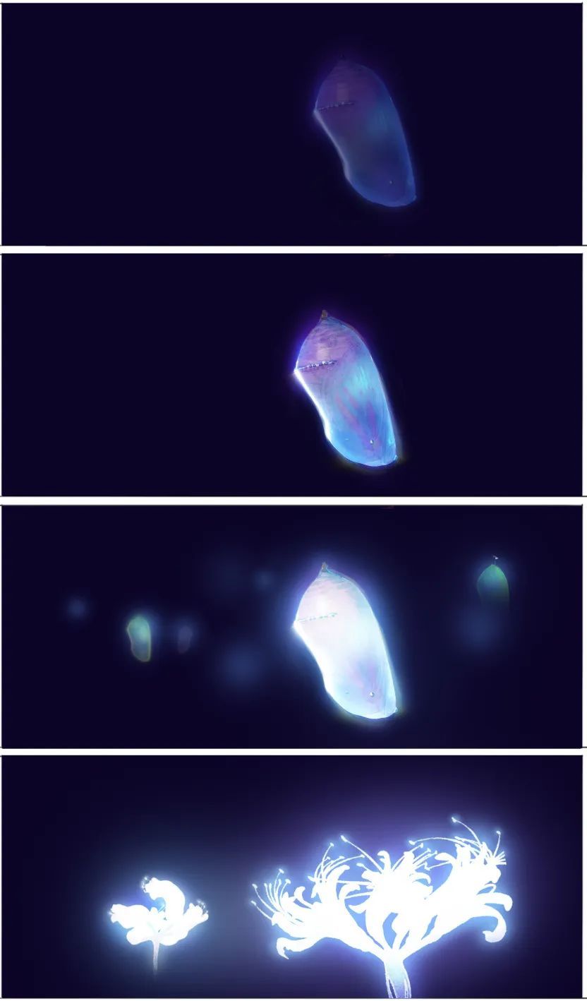 两种形态的转变主要靠能量的收集与汇聚。第一形态过后,赛车的四个轮包结构打开,会生成一个能量形式的翅膀扇动,这个阶段的翅膀是比较圆润、轻盈的,是还未完全成长的状态。