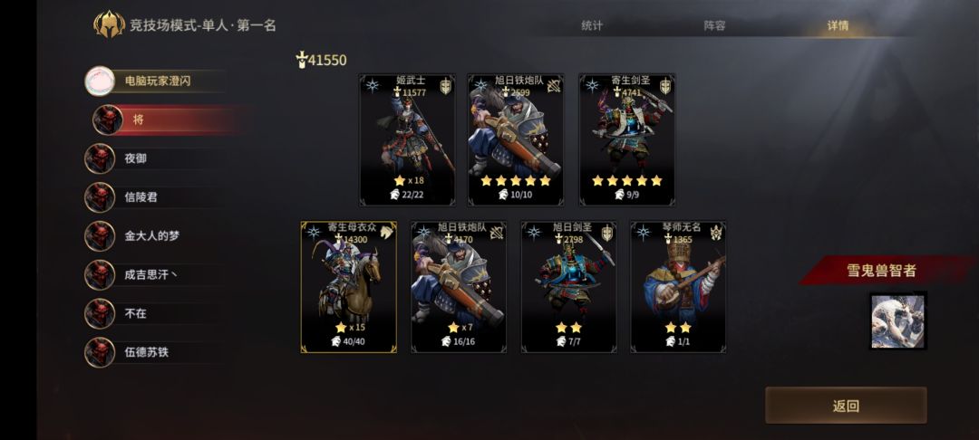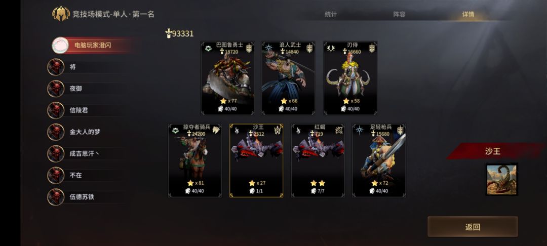 可以看出,决赛阶段,我的战力高了第二名正常发育阵容一倍还多。不过虽然决赛是我9w打他4w,但是打完存活只剩1w6战斗了,但这并不影响我们暴打未成型阵容。