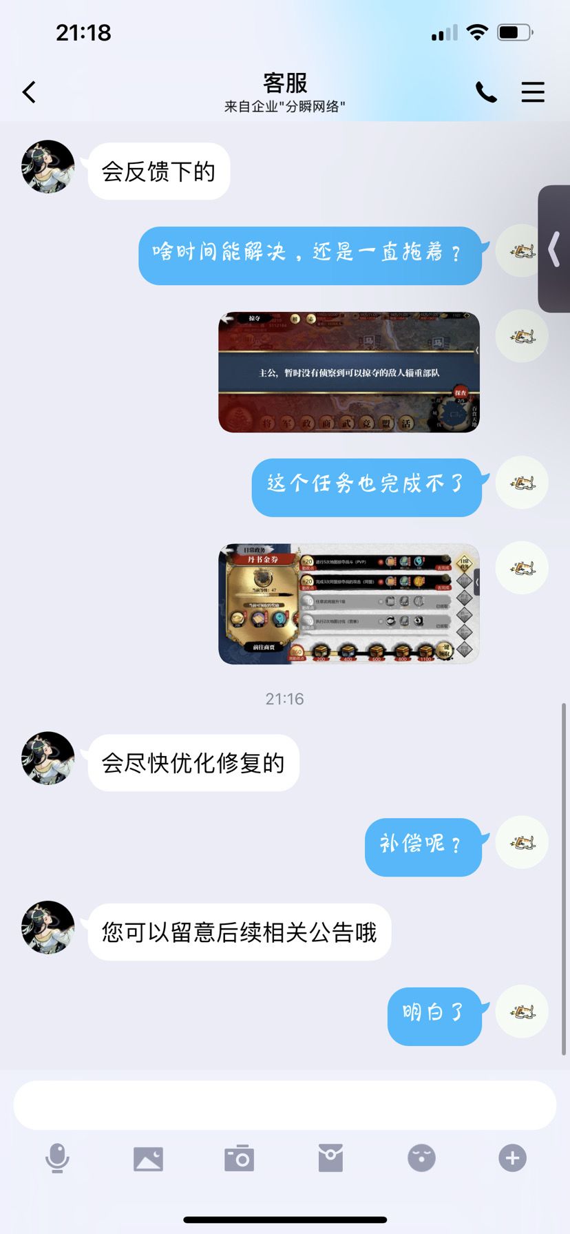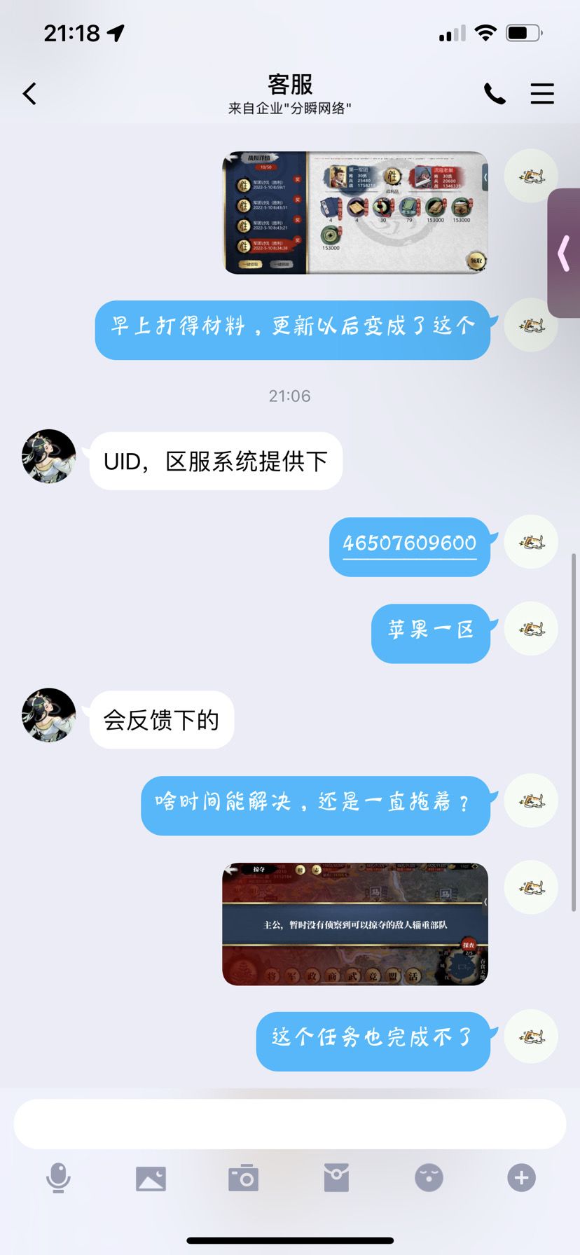 最后就是,开始看更新说明以为每天获得的装备材料变化不大,结果变成了少的可怜,真是无敌了,大家之前买的粮草基本用处也不大了,真是无敌他吗给无敌开门,无敌到家了。下面放上和客服的聊天记录,简单来说就是,对于我们造成的问题,只能说句活该了