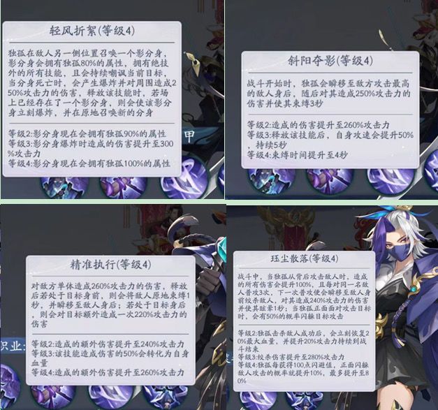 2技能 斜阳夺影:开局跳后造成260%攻击并控制目标4秒,提升自身攻速50%。这个如字面意思独孤珏的第一个控制技能; 3技能 精准执行:单体核心输出技能,特别是位于目标身后时造成520%的伤害,这个伤害再结合4技能及六脉神剑可以增幅到夸张的2080%的伤害,暴击的话是4160%的伤害,基本上是直接秒杀的节奏,位于身前的话则小控1秒,另该技能50%伤害吸血保证续航;