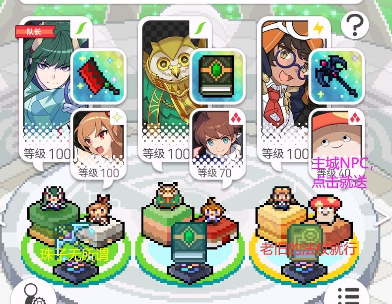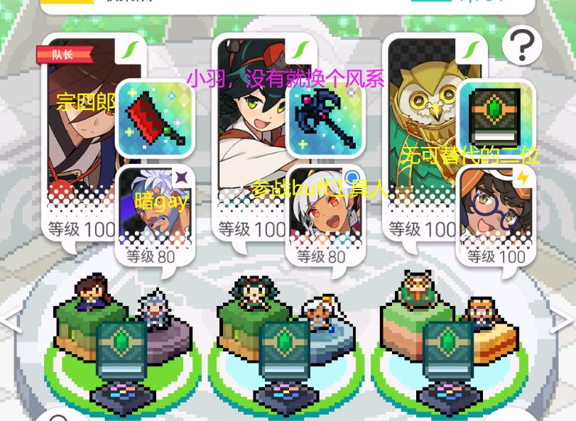 上面这个队伍菜刀替换为虎王斧,白虎商店的金币武器,主打技伤,更便宜而且伤害应该略高一筹。最优选是羁绊枪,没有伤害会差很多。PS:猫头鹰和技工换一下位置才能吃到虎王斧的效果,这里忘记改了,感谢有人指正。这样组就是前期标配的技伤风,推图等默认采取这个队伍吧。
