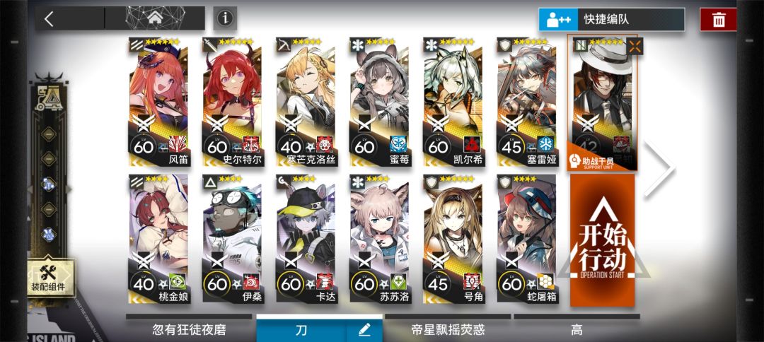 分享一下我的镀层打法。卡达带出来是为了增加容错,带42单纯不想打年糕,伊桑单纯的概率触发器,给号角过载直接远处秒闪避哥用的,小车控下号角的过载轴,凯尔希m3高输出快活用,切左上角。
