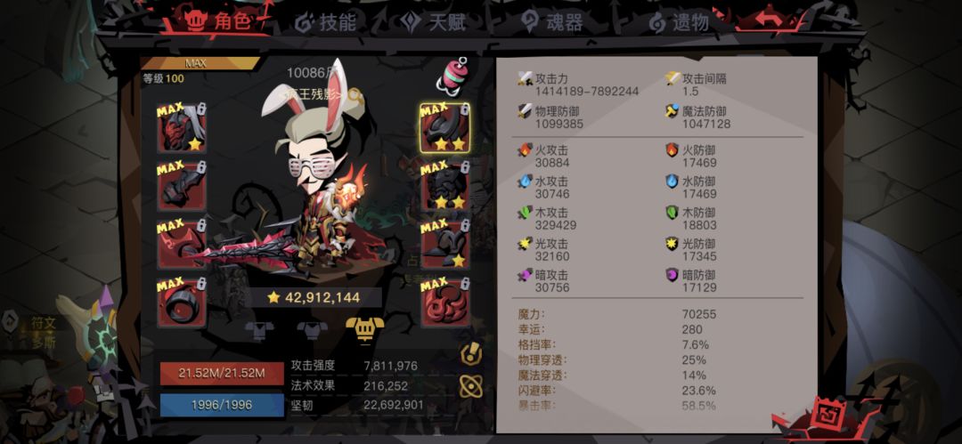实现97级换暗金套通关精英12,属性图如下,然后收菜3个星期到99级转盾(95版本收菜了一个版本),99搭97散件轻松180w光就可以开始混100红装了,每天都很轻松。在105版本来临前,集齐100级大剑红套,和3件100的盾装(运气好5件也行),利用100红套大剑通关13精英,然后又转盾(100加99散件)完美继续混105红装,以下是暗金大剑通关属性,大家加油。