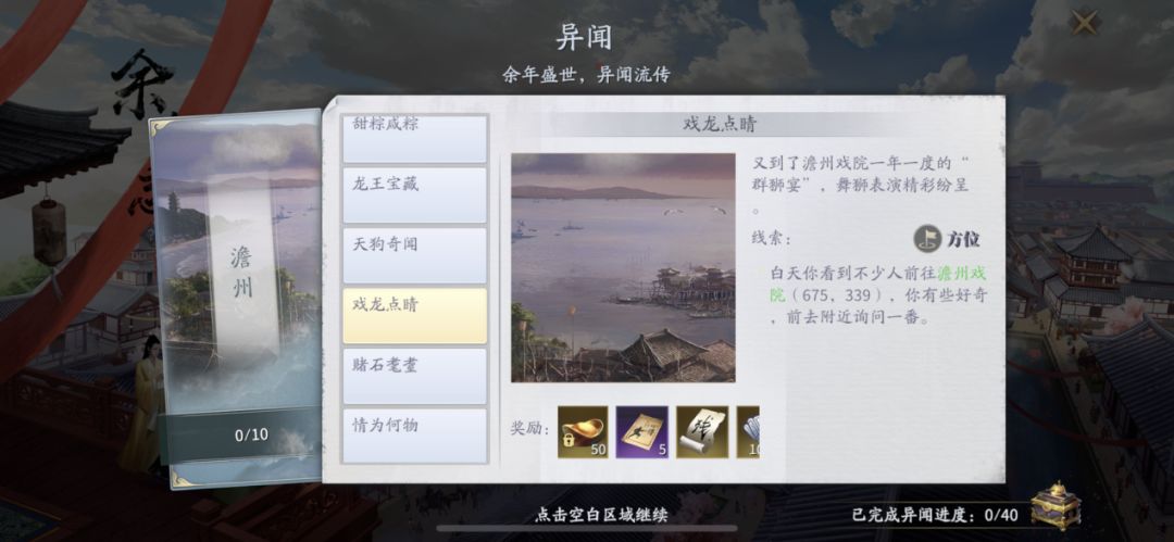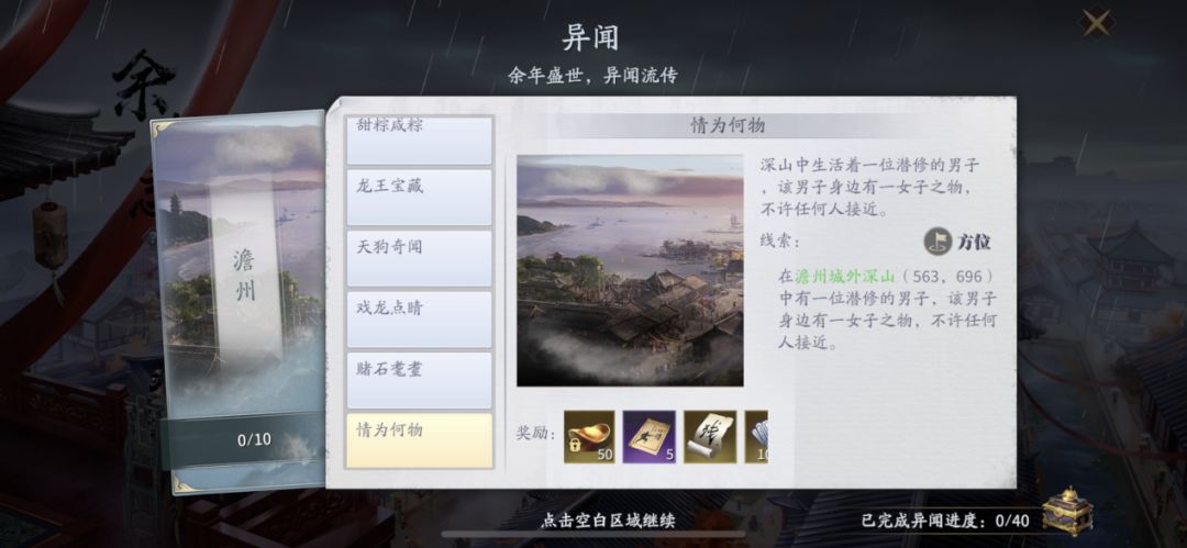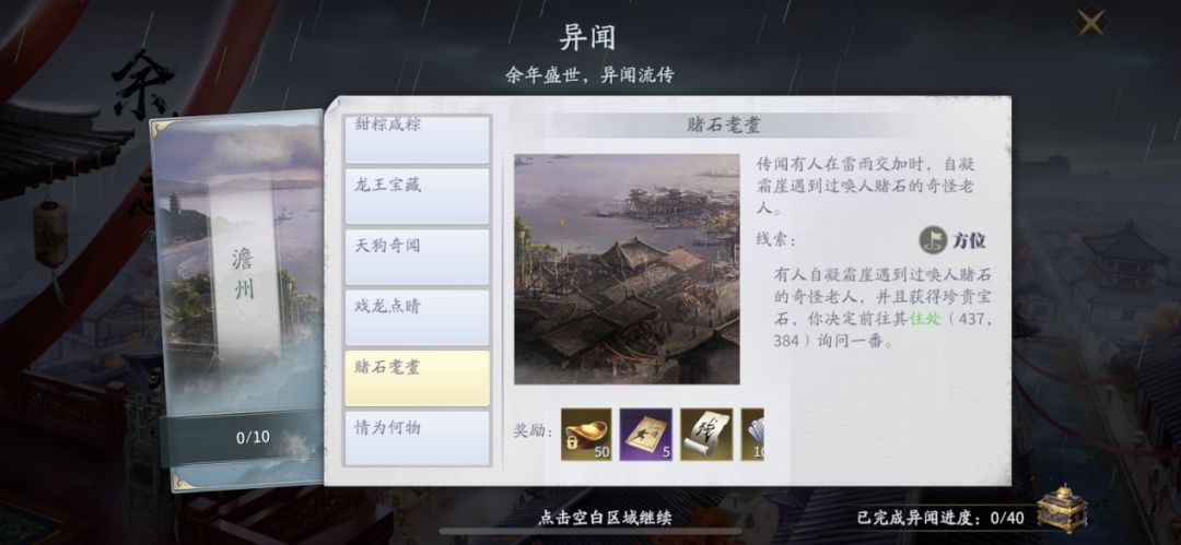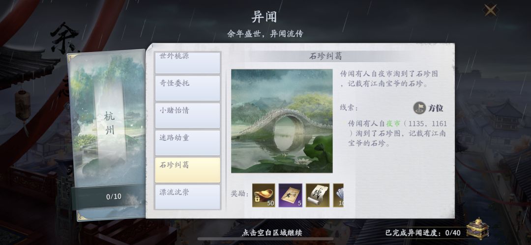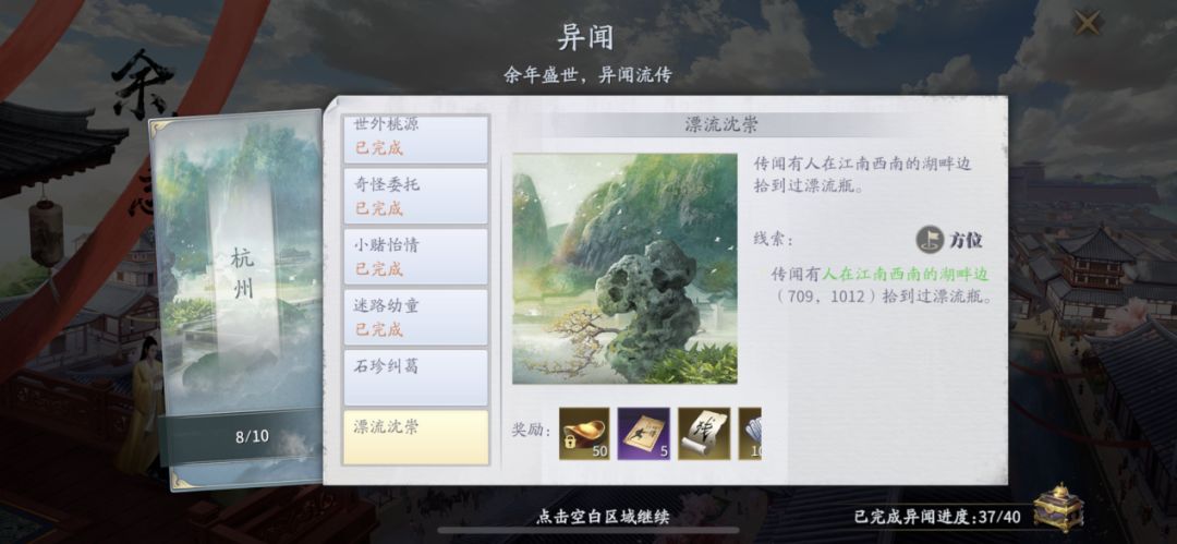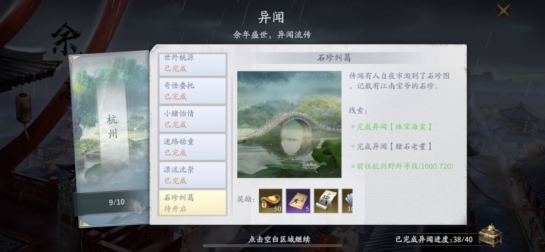 (2)在达成前置条件完异闻成【赌石老耋】【殊宝海棠】后,前往杭州野外坐标【1000,720】,后续任务按提示完成即可。