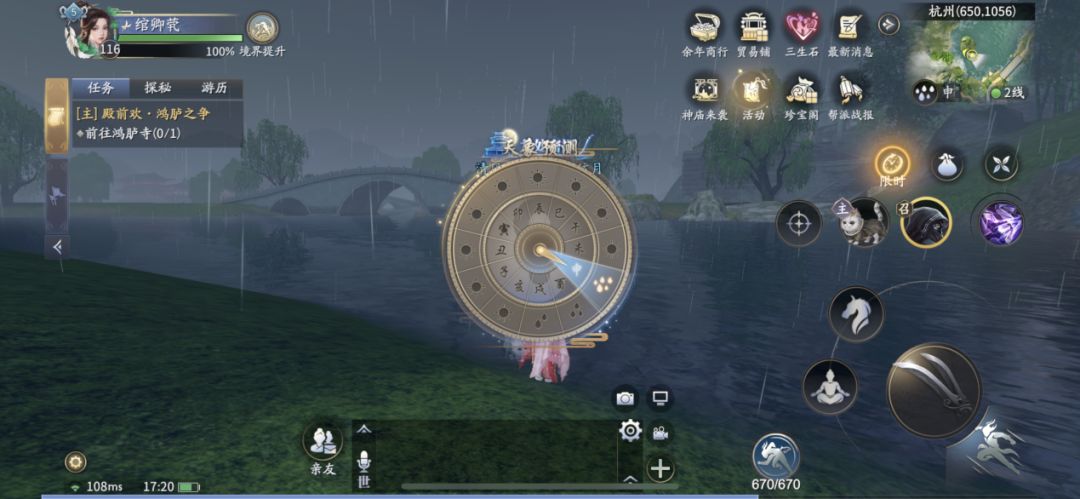 【提示】天象预测表盘:每一格为现实世界十分钟,转一圈为现实世界二小时,游戏子时刷新天气预测表盘。(现实世界0点、2点、4点、6点、8点、10点、12点、14点、16点、18点、20点、22点)大家可以定好闹表,等待刷新,查看是否出现任务所需天气!