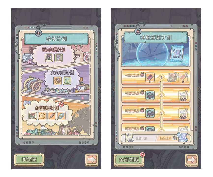 -根据进化次数及基因强度,可领取成长计划奖励,购买特级计划后,可获得限定肖像、贵重品、大量资源等额外奖励